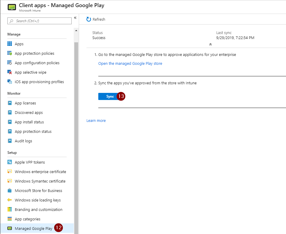 To sync the link to Intune, go back to the ‘Client Apps’ overview, click on ‘Managed Google Play’ and select Sync.