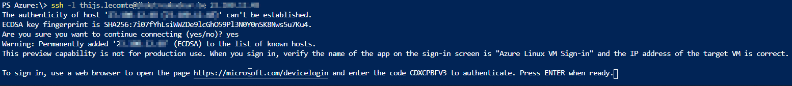Logging into a Linux machine happens through a device login through Azure CLI. Just start an SSH command, specify your UPN & correct IP.
