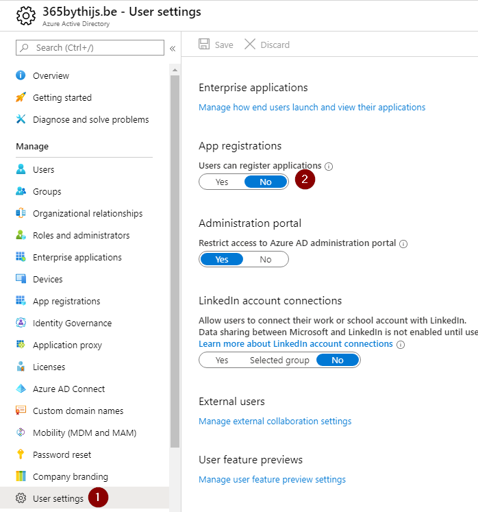 To do this, go to Azure Active Directory, navigate to ‘User Settings’ and select ‘No’ below to option ‘Users can register applications’.