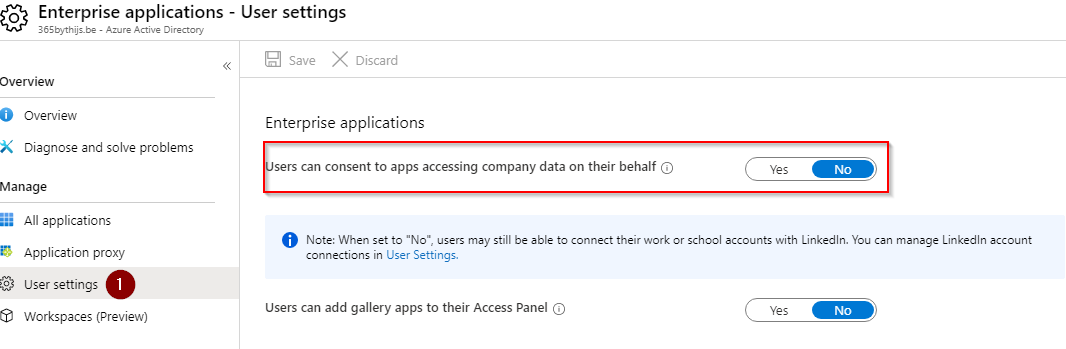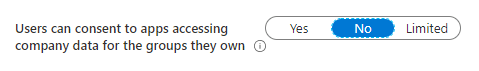 Microsoft has implemented some more controls for user consent to applications. In the ‘User settings’ pane, there is the option to allow users to consent to apps that access company data for groups they are an owner off. I would still advise this to be turned off, as this can have a huge impact.
