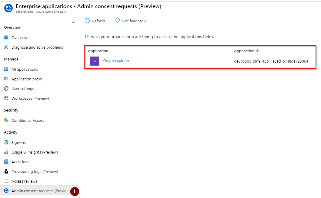 - Navigating to the requests portal manually (Azure Active Directory – Enterprise Applications – Admin Consent Requests)