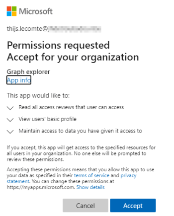 If the admin chooses to review the permissions he will start the consent workflow and be able to accept the permissions: