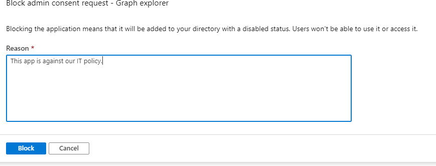 If you choose to block access, the application will be blocked for all users to sign into. The administrator is able to provide a reason:
