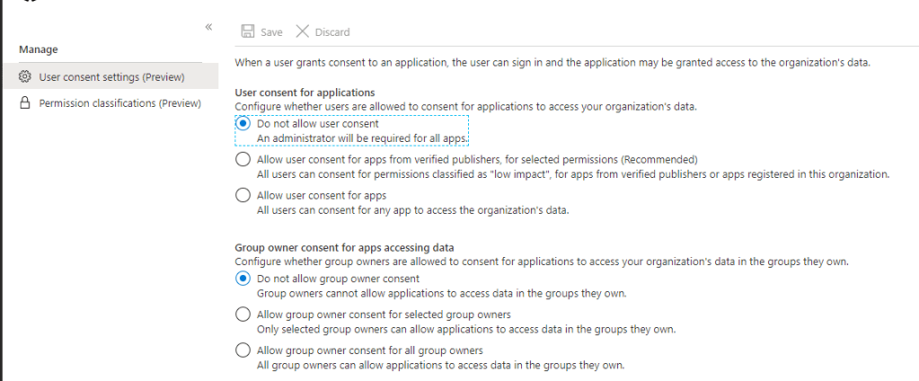 For option 2, you can configure which permissions a user can consent too in the ‘permission classifications’ tab. This is a great option if you want to allow users to use their AAD credentials to sign into third party applications, but require admin consent when that applications tries to read any data.
