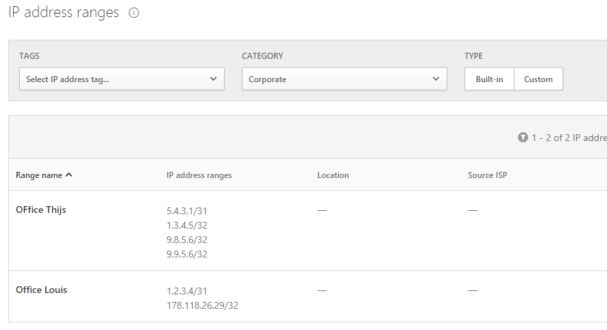 Every Microsoft 365 Security engineer has the same struggle: maintaining corporate IP-address range needs to be done in two places. Once in trusted named locations in Azure AD and once in corporate ‘IP ranges’ in MCAS. It is really important to configure these both. In Azure AD, (trusted) named locations are used in Conditional Access policies and in MCAS, the ranges are used within alert policies and can be helpful during investigations.