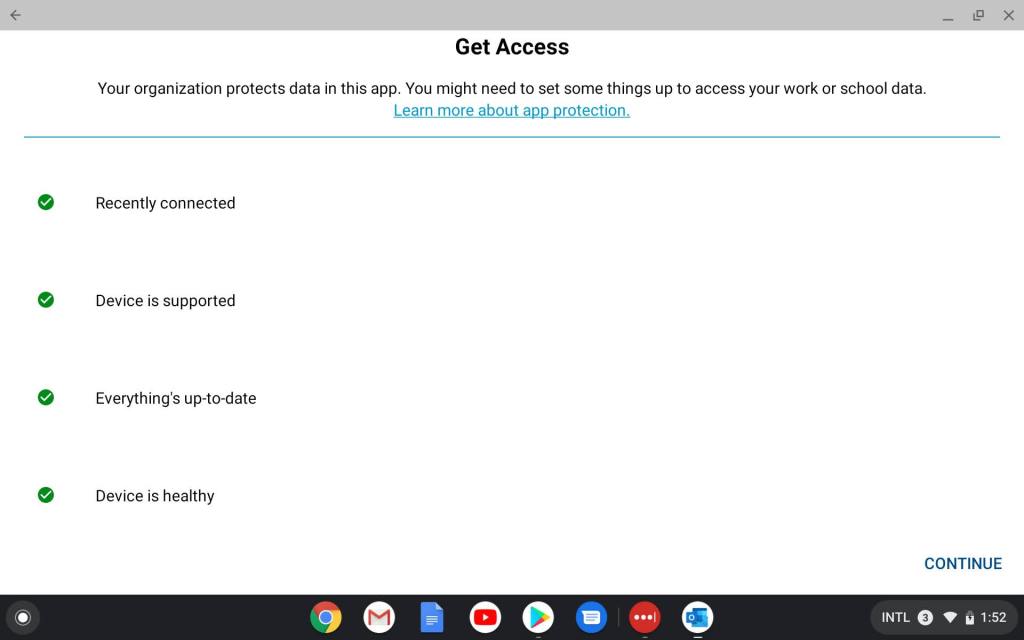 After downloading the Company Portal from the Play Store and logging into my account, all seemed well. But then the limitations for the ChromeOS platform come into play as we have no way of enrolling our tablet. While the Operating System states ‘Android’, it does seem that the Company Portal is aware that this is Chromebook and blocks our enrollment.